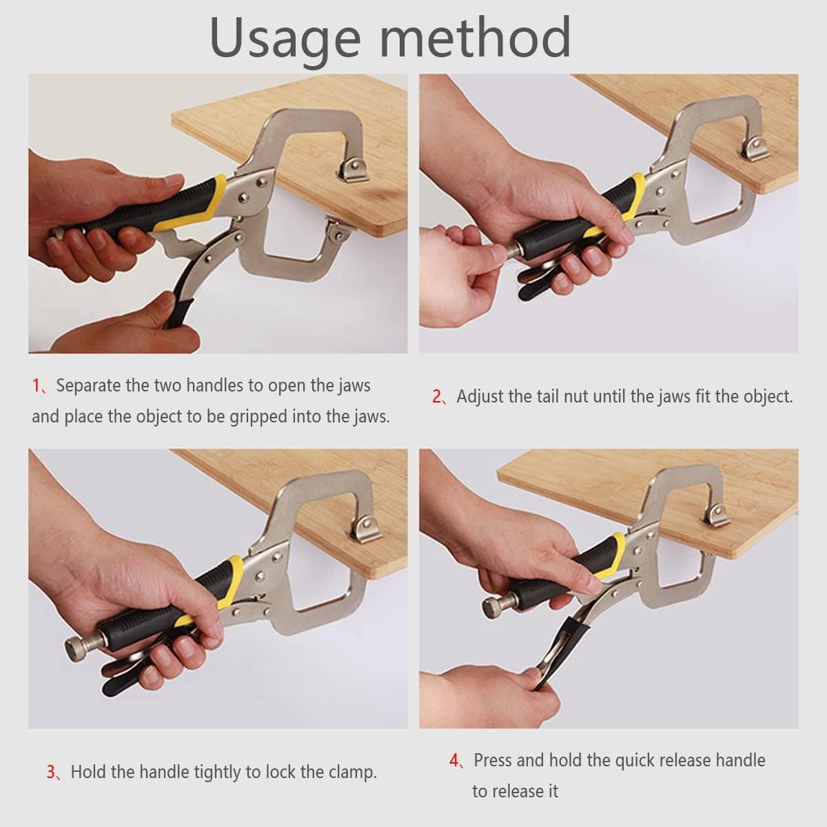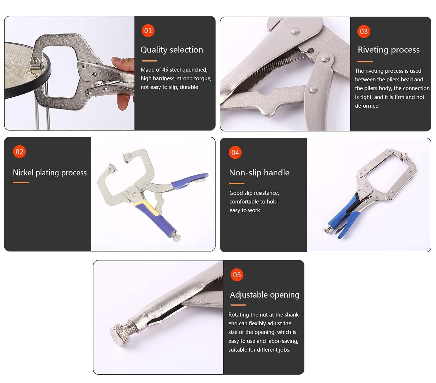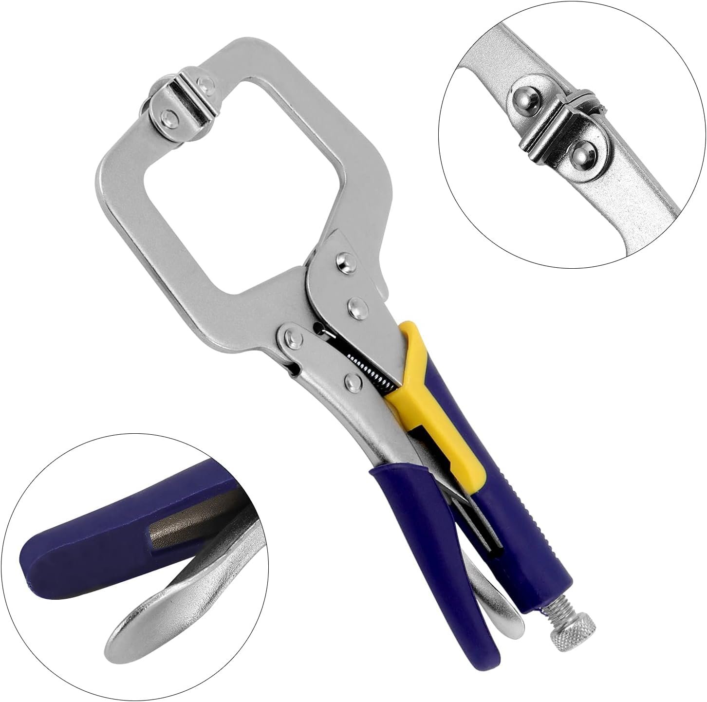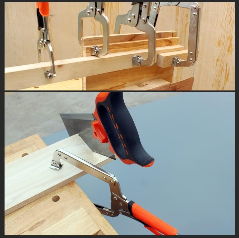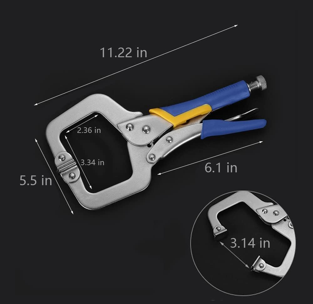 11-Inch Locking C-Clamp Plier Set: This 11-inch locking C-clamp plier set is designed to provide a tight, secure hold for welding, cutting, and assembly tasks. Constructed from durable chrome vanadium steel, the clamps offer strength and long service life in demanding workshop environments. The adjustable swivel jaws automatically adapt to different surface shapes, ensuring precise and stable clamping without repeated manual adjustment. Compact and easy to operate with one hand, these locking clamp pliers are suitable for metalworking, woodworking, fabrication, and general fixing applications at home or in professional workshops.