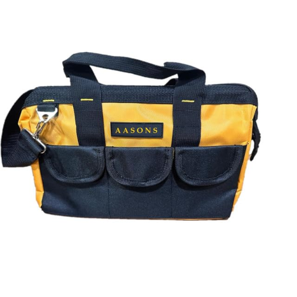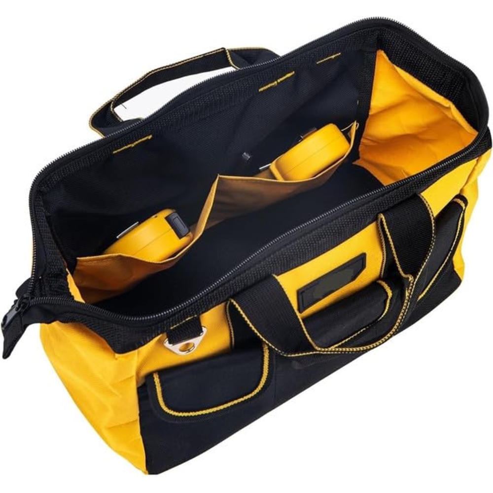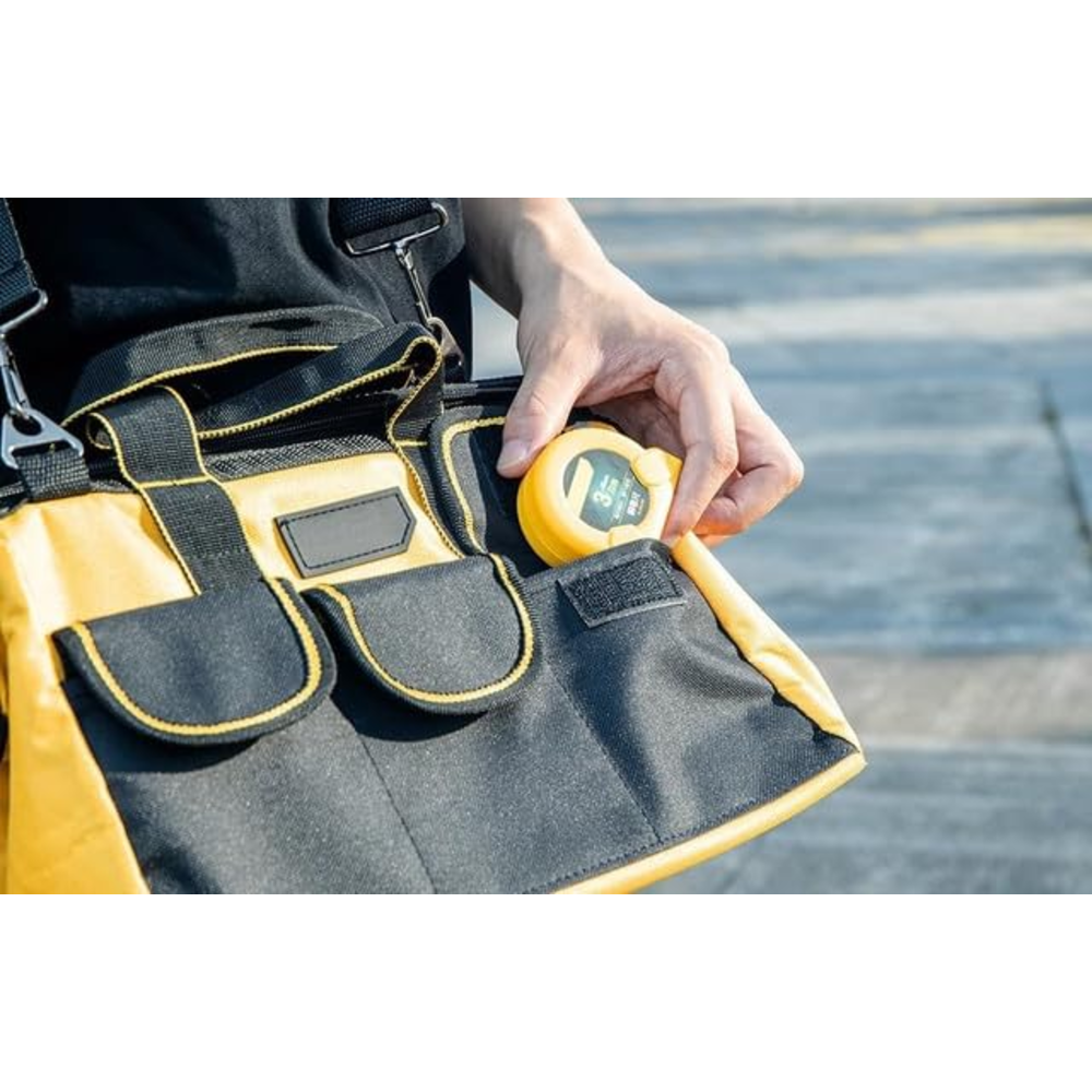 This heavy-duty tool bag features a handy pop-open design and a large interior compartment for effortless tool access. Built with five wear-resistant rubber foot pads and a three-layer Oxford cloth bottom, it stands upright on its own, preventing deformation and direct ground contact. The robust ballistic poly fabric construction offers superior durability, outperforming traditional materials. With six interior and eight exterior pockets, it provides professional organization for all your common tools. Complete with an extra padded handle and adjustable shoulder strap for comfort, this lightweight and portable bag is ideal for safe, secure transit for both professionals and homeowners.
