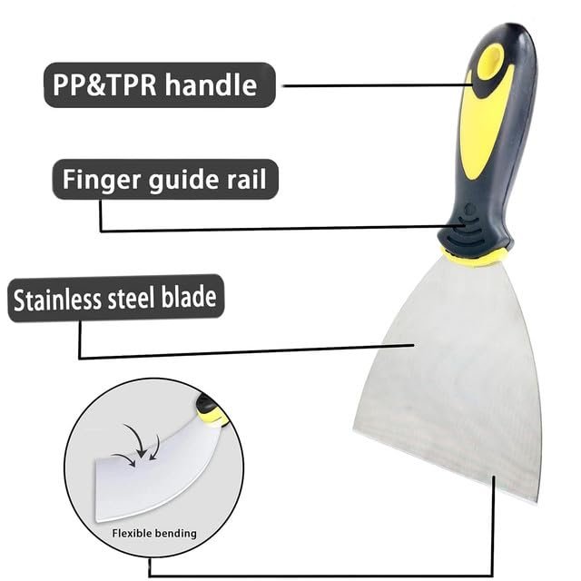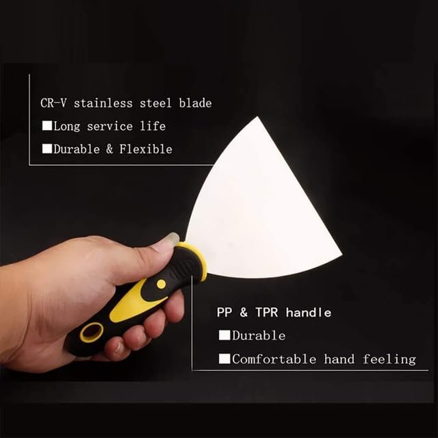 4-Inch Paint Scraper & Putty Knife: This 4-inch paint scraper and putty knife is designed for efficient scraping, surface preparation, and wall repair tasks. The blade is manufactured from high-quality tempered CR-V alloy steel, offering durability, flexibility, and long service life. Its ergonomic non-slip handle provides a comfortable grip, reducing hand fatigue during extended use and remaining reliable even in damp conditions. Suitable for paint removal, wallpaper scraping, plastering, and general surface cleaning, this tool is a practical choice for painting projects, renovation work, and everyday maintenance tasks.