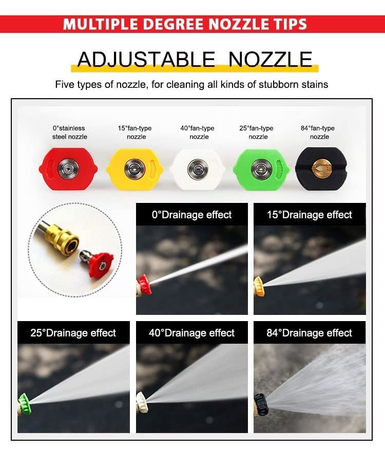 This pressure washer nozzle and foam lance set is designed for versatile and efficient cleaning applications. Featuring a 1/4-inch quick connect fitting, it is compatible with most electric and gas pressure washers. The foam lance includes adjustable controls for foam concentration and spray pattern, allowing precise mixing and coverage. Manufactured with durable brass components, it supports operation up to 4500 PSI. The five spray nozzle tips offer multiple angle options for washing vehicles, driveways, roofs, siding, and floors, making it suitable for professional and home use.